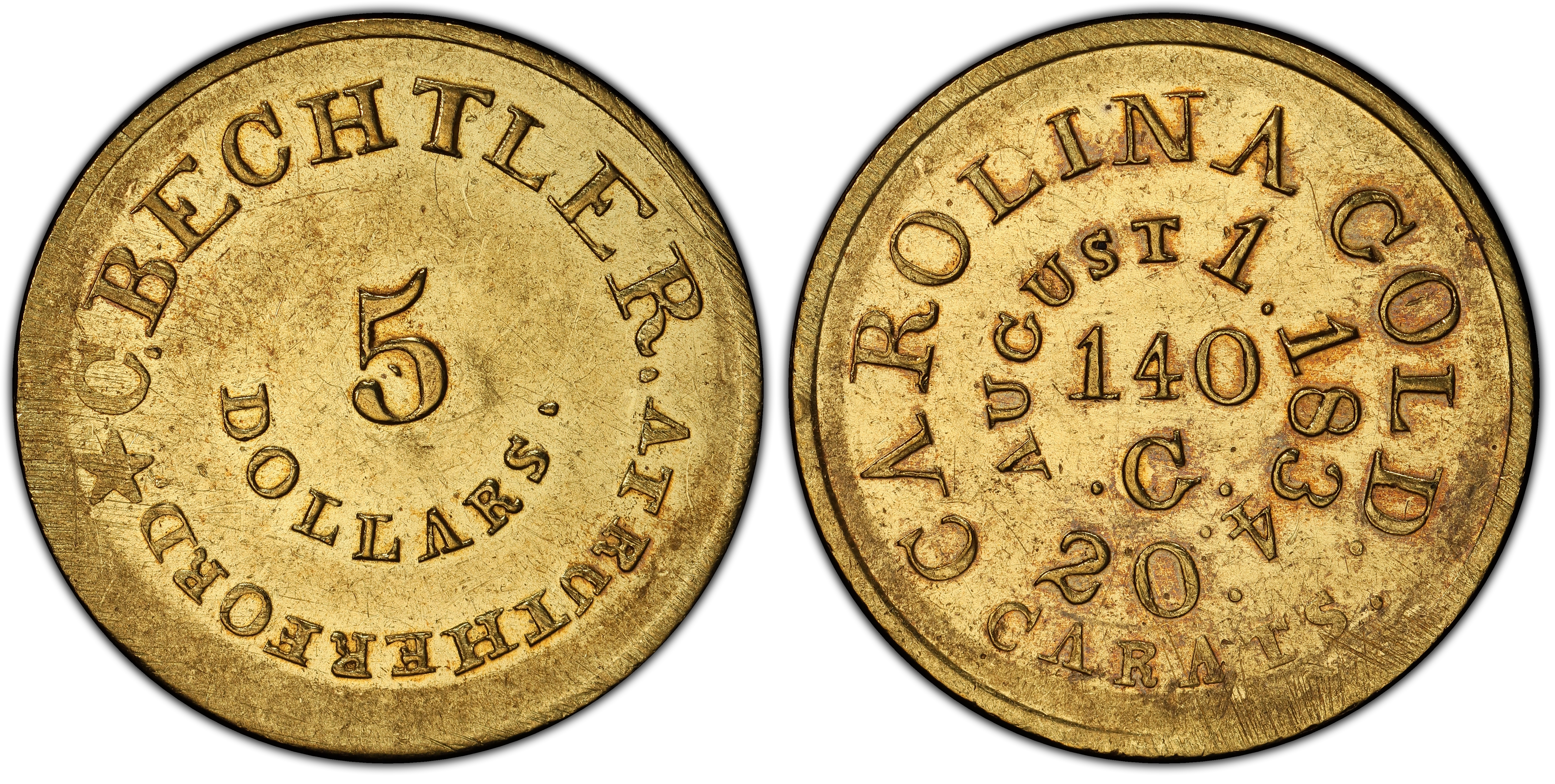 Reverse DescriptionThe central device is the denomination '5 / DOLLARS.'. The peripheral legend identifies the minter and location, 'C. BECHTLER. AT RUTHERFORD.', often with a star or other ornamentation.