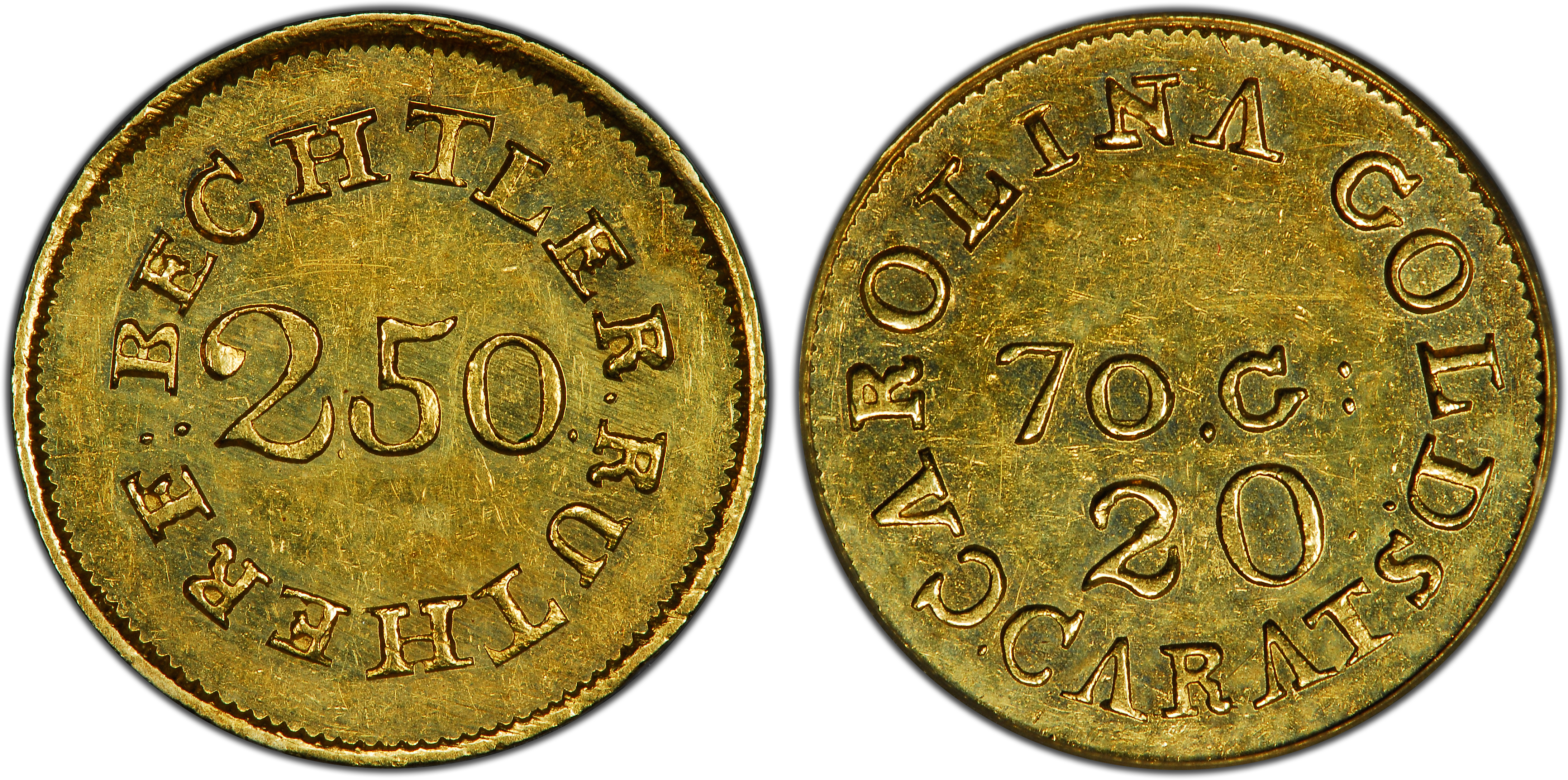 Reverse DescriptionThe minter's name and location, 'BECHTLER . RUTHERF :', are arched along the upper periphery. The denomination, '250', is boldly punched in the center, representing 250 cents or $2.50.