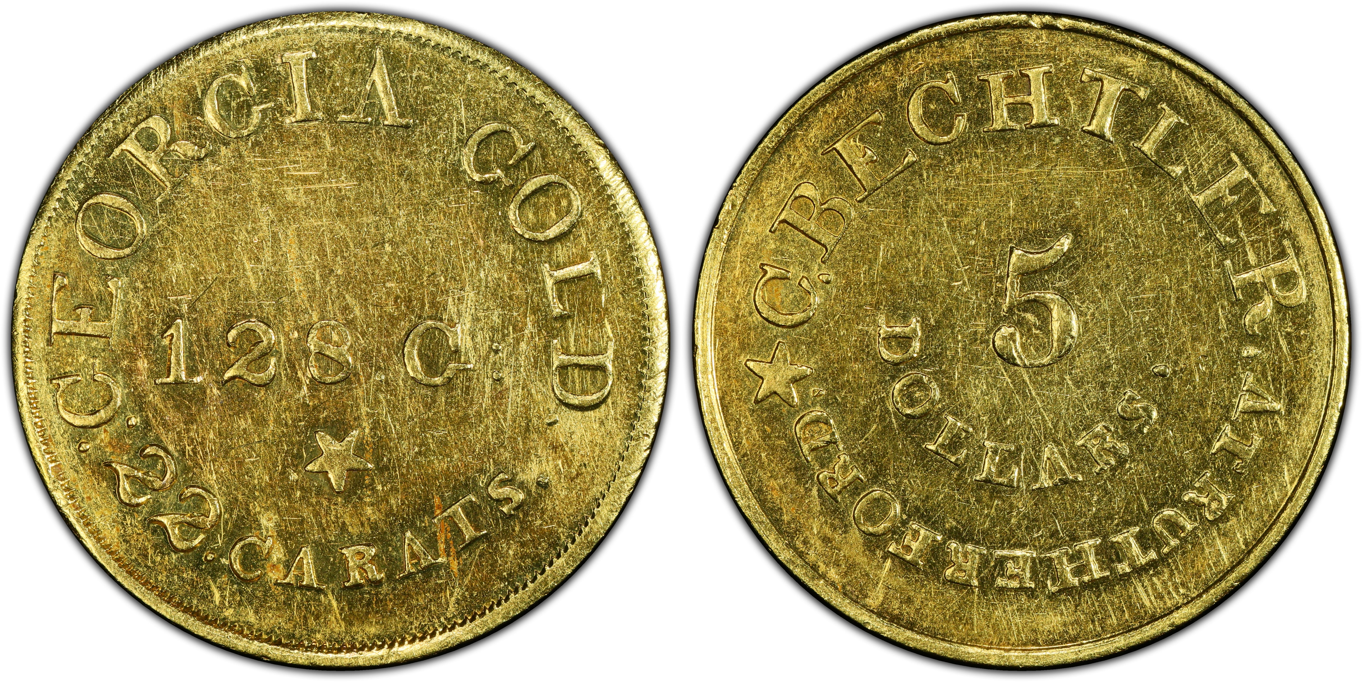 (1837-42) $5 C. Bechtler, Georgia Gold, "128.G:" (Regular Strike)