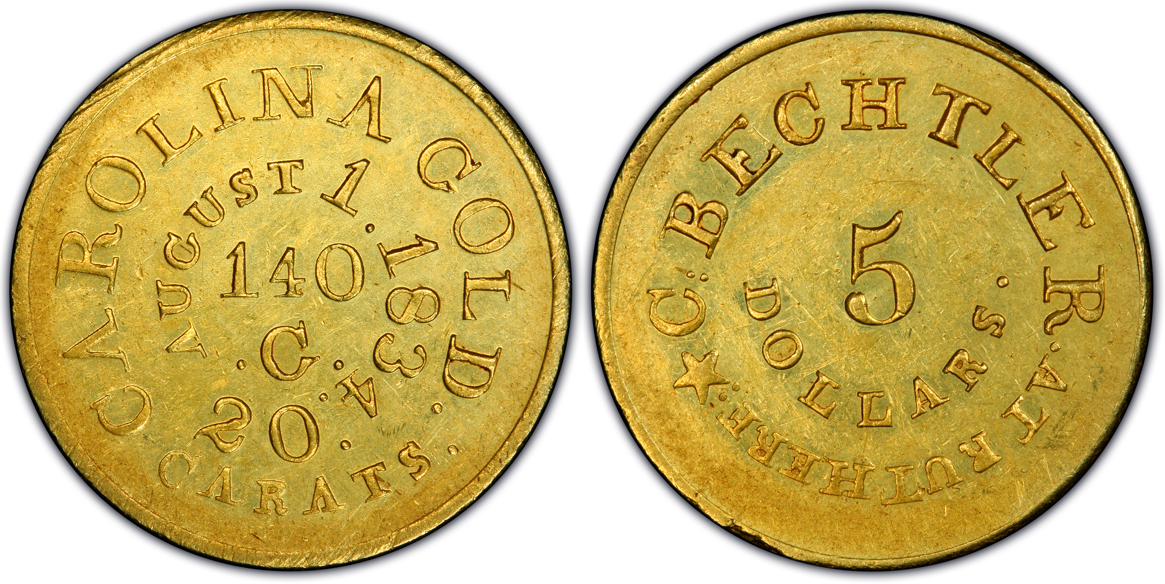 Obverse DescriptionThe design is purely utilitarian, consisting entirely of text. Centered is the weight and fineness, '140. G.' (Grains) and '20 CARATS'. On some varieties, the date 'AUGUST 1, 1834' is included in an inner circle. Encircling the central text is the legend 'CAROLINA GOLD'.