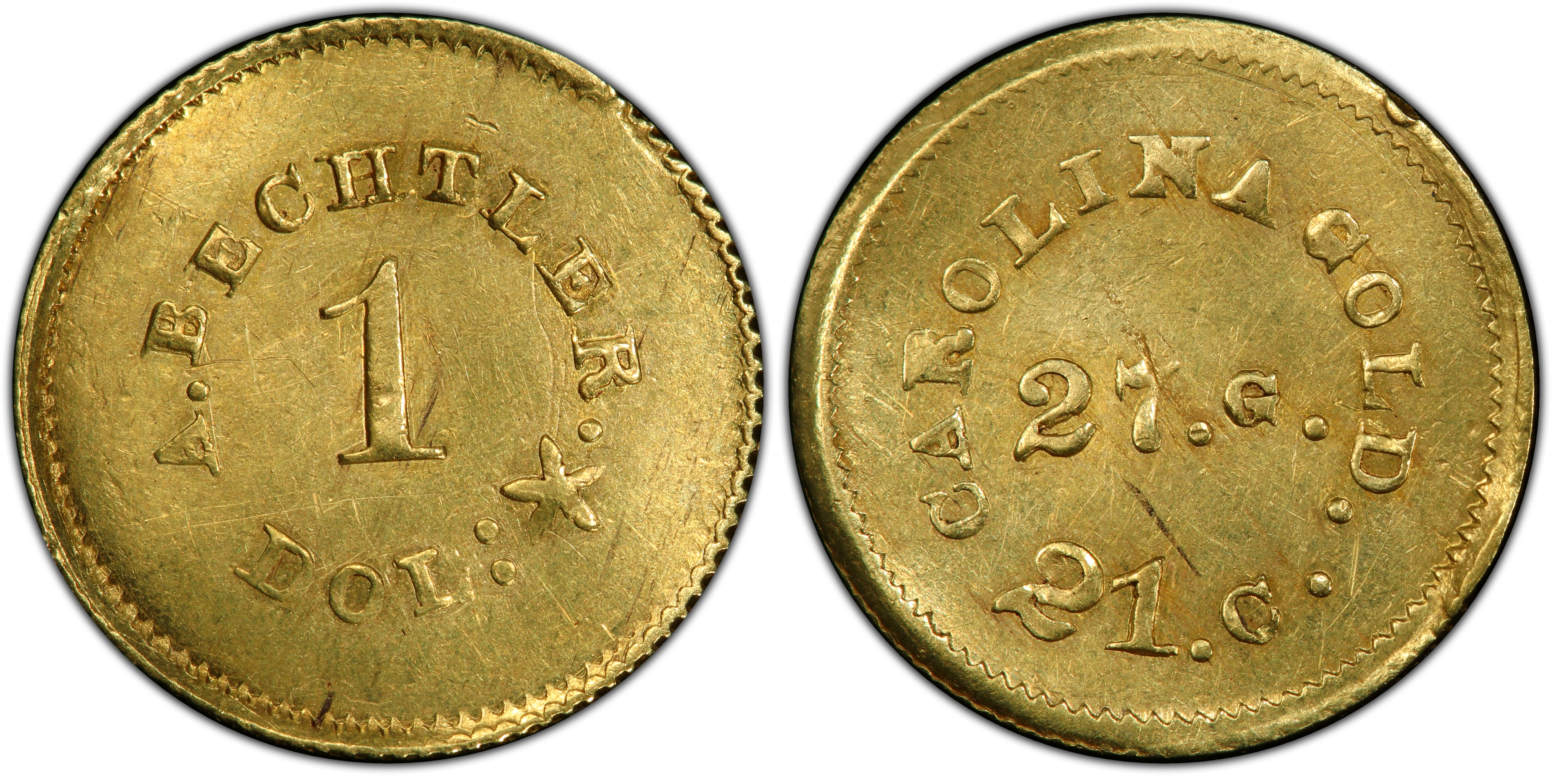 Circulated Wear PatternsWear would first appear as a slight flattening across the highest surfaces of the letters and the central star. The '27. G.' and '1 DOL:' being the most central elements, would likely show the first signs of friction. On lower grade examples, the individual letters in 'CAROLINA GOLD' and 'A. BECHTLER' would begin to lose their sharp edges and blend slightly into the fields. The reeding on the edge would also show flattening and loss of definition.