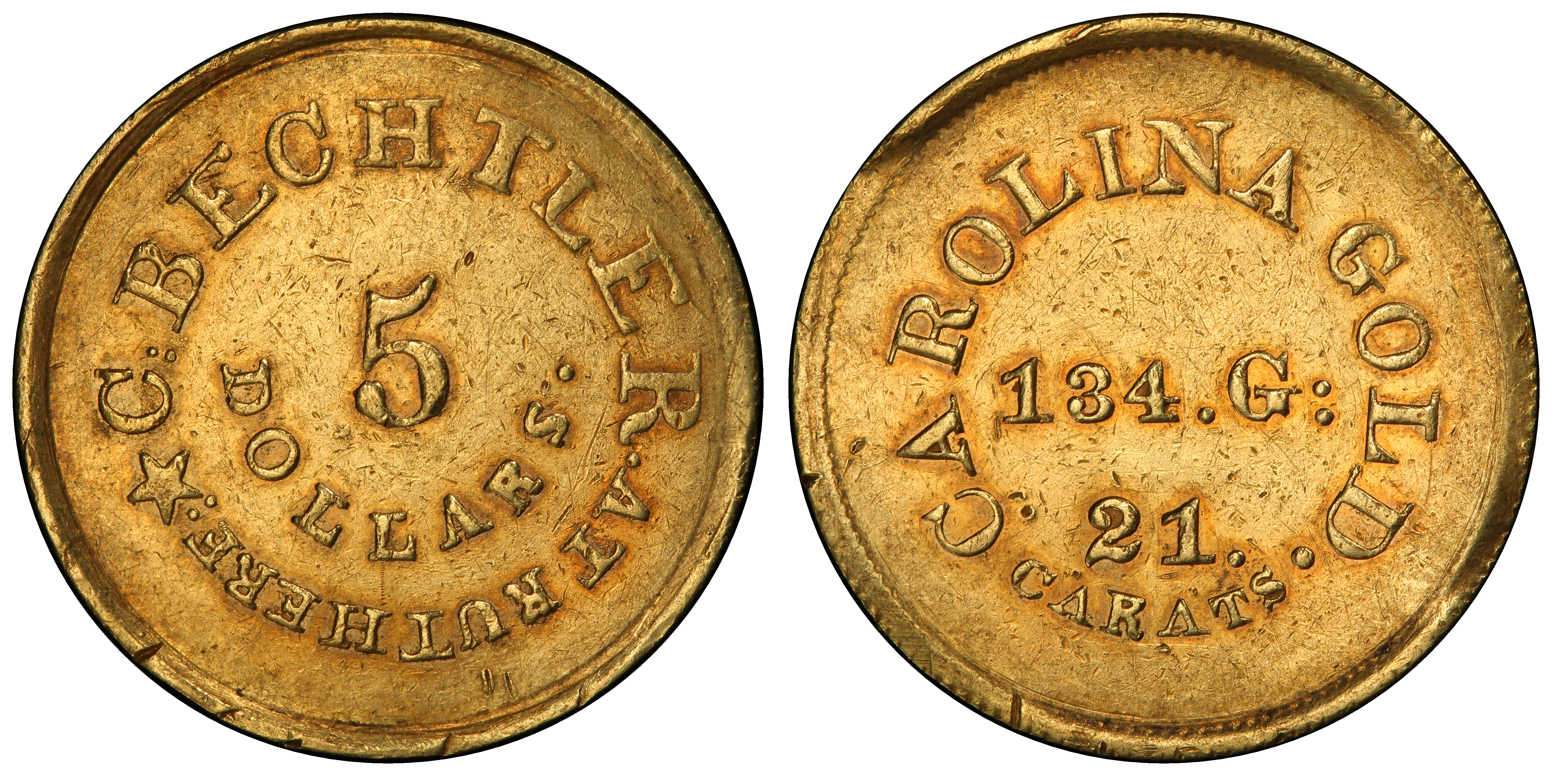 (1842-52) $5 C. Bechtler, 134 Grains, 21 Carats (Regular Strike)